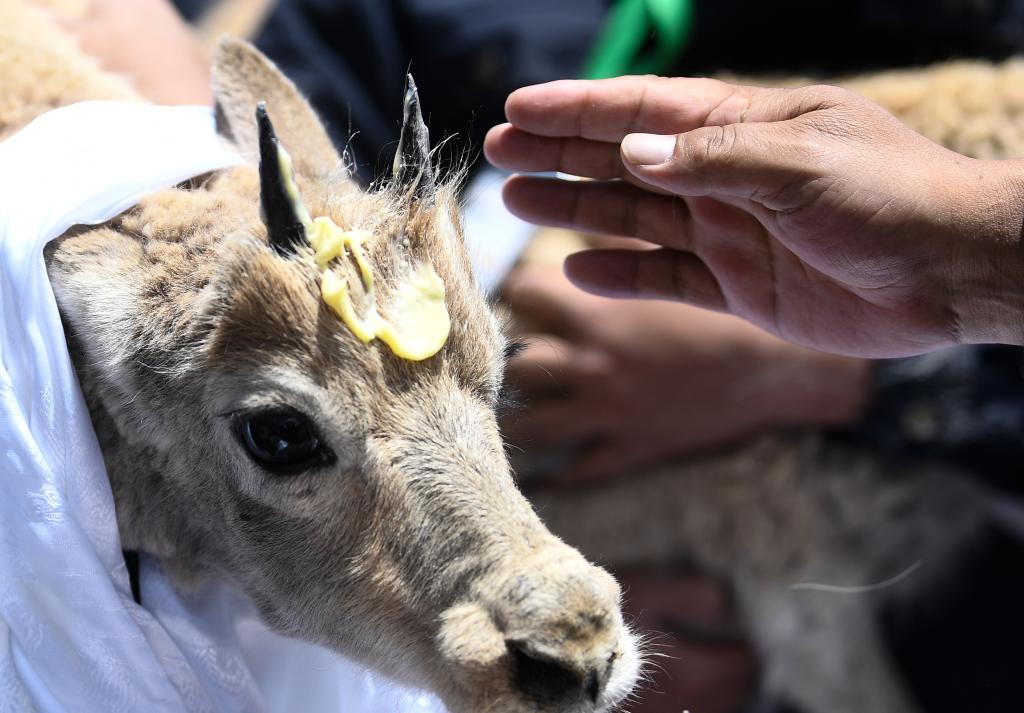 7月7日,在可可西里索南達(dá)杰保護(hù)站野生動物救助中心,可可西里巡山隊(duì)員按照風(fēng)俗,在即將回歸大自然的藏羚羊額頭上涂抹酥油表達(dá)祝福。 新華社記者 張龍攝