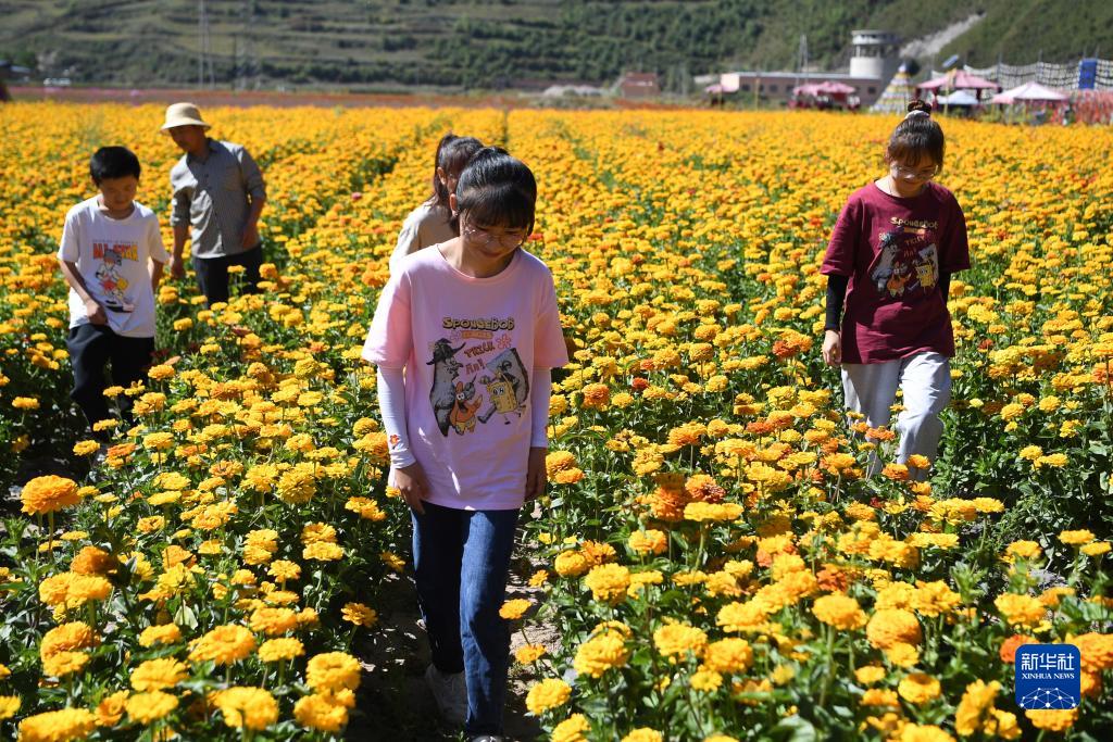 游客在甘肅甘南卓尼縣木耳鎮(zhèn)力賽村的花海游覽(9月11日攝)。新華社記者 陳斌 攝