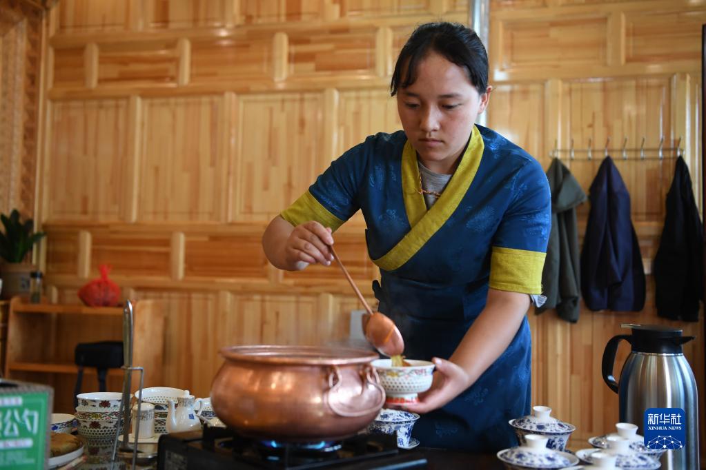 甘肅甘南卓尼縣木耳鎮(zhèn)力賽村村民拉姆卓瑪在自家的農(nóng)家樂里為客人盛湯(9月11日攝)。新華社記者 陳斌 攝