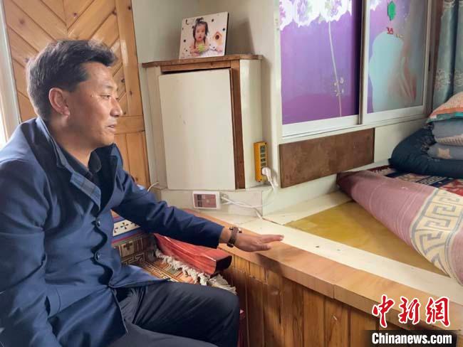 圖為合作市堅(jiān)木克爾街道黨工委書記阿黑介紹村民家的碳纖維電熱炕板?!∷巫雨?攝