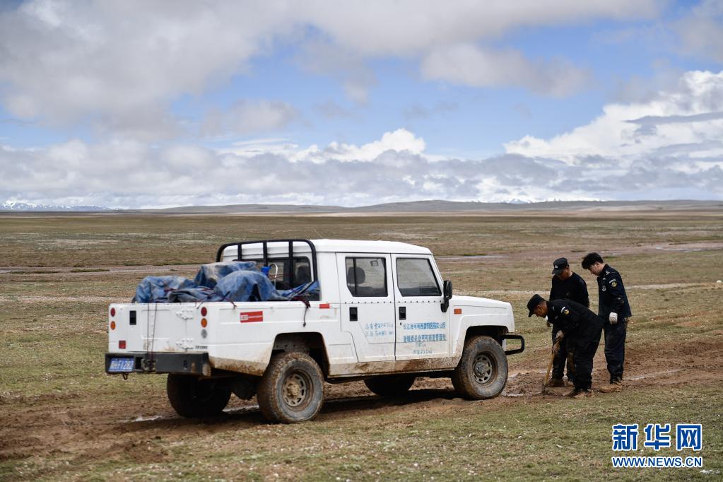 在前往可可西里卓乃湖保護站途中,巡山隊員將車輛移出泥坑(2020年7月6日攝)。新華社 張龍 攝