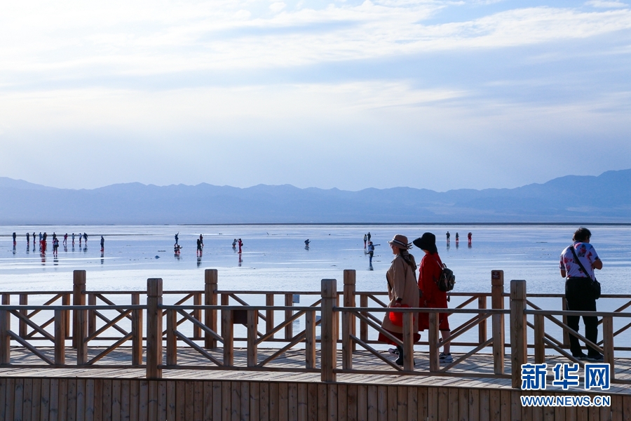 游客在茶卡鹽湖“天空之鏡”景區(qū)漫步。新華網(wǎng) 卡婭梅朵 攝