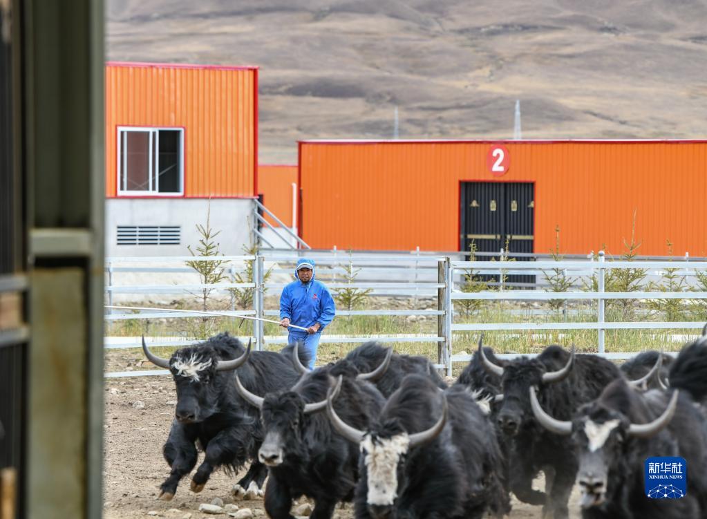 10月20日,在四川省甘孜藏族自治州理塘縣牦牛產(chǎn)業(yè)園區(qū),飼養(yǎng)員將牦牛趕回育肥大棚。新華社記者 王曦 攝