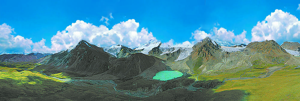 遠(yuǎn)眺索布查葉,山脈頂部云霧環(huán)繞,山坡上青翠欲滴,山腳下無(wú)數(shù)銀鏈般的細(xì)流在廣袤的草地上開枝散葉。
