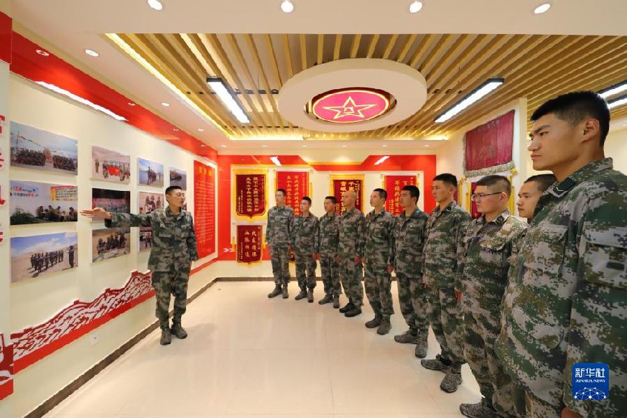 聯(lián)勤保障部隊(duì)汽車運(yùn)輸某團(tuán)一營(yíng)一連連長(zhǎng)孟凡龍(左一)為新兵講述連隊(duì)歷史(7月11日攝)。新華社發(fā)