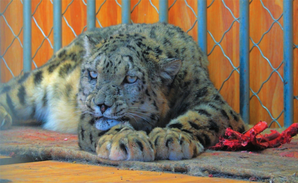 “在巖壁下發(fā)現(xiàn)了它,因為流血過多已經(jīng)奄奄一息了。它的一個前肢斷了,現(xiàn)在走路還是一瘸一拐的?!蓖瑸樽o林員的根呷介紹,當時這只雪豹在同另外一只雪豹搶食落敗后受傷,因為真達鄉(xiāng)尚未建立動物救助中心,雪豹便寄養(yǎng)在甲它家中。鄉(xiāng)政府出資修建了雪豹居住的“鐵籠”,甲它負責給它喂食,甲它的妻子則每隔一段時間就要為這頭猛獸打掃一次圈舍。