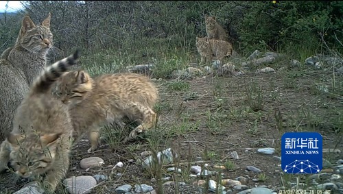 這是布設(shè)在祁連山國家公園青海片區(qū)的紅外相機拍攝到的5只荒漠貓同框畫面(2020年7月3日攝)。新華社發(fā)(祁連山國家公園青海省管理局供圖)