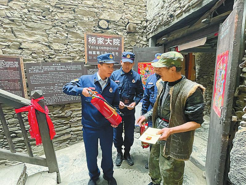 在被譽(yù)為“羌族建筑藝術(shù)活化石”的桃坪羌寨,羌族每家都設(shè)“火塘”,羌寨內(nèi)部采用木材構(gòu)造,稍有不慎極易引發(fā)火災(zāi)。到寨子組織滅火演練、開(kāi)展防火巡查、宣傳消防知識(shí)、提供便民服務(wù),就成了陳洪橋和戰(zhàn)友們每天雷不打不動(dòng)的事,“一定要注意用火用電!”“老鄉(xiāng),請(qǐng)記得‘人走火滅’哦!”“你好,需要幫助嗎?”……這是他們每天不厭其煩對(duì)寨中群眾和游客重復(fù)最多的話。寨中每一條疏散通道、每一條暗溝水渠以及每一家房子結(jié)構(gòu)布局,消防員們都了然于胸、爛熟于心。