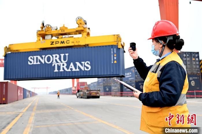 圖為周祖瑾對中歐班列集裝箱裝卸作業(yè)進(jìn)行安全監(jiān)控。鄧文鑫 攝