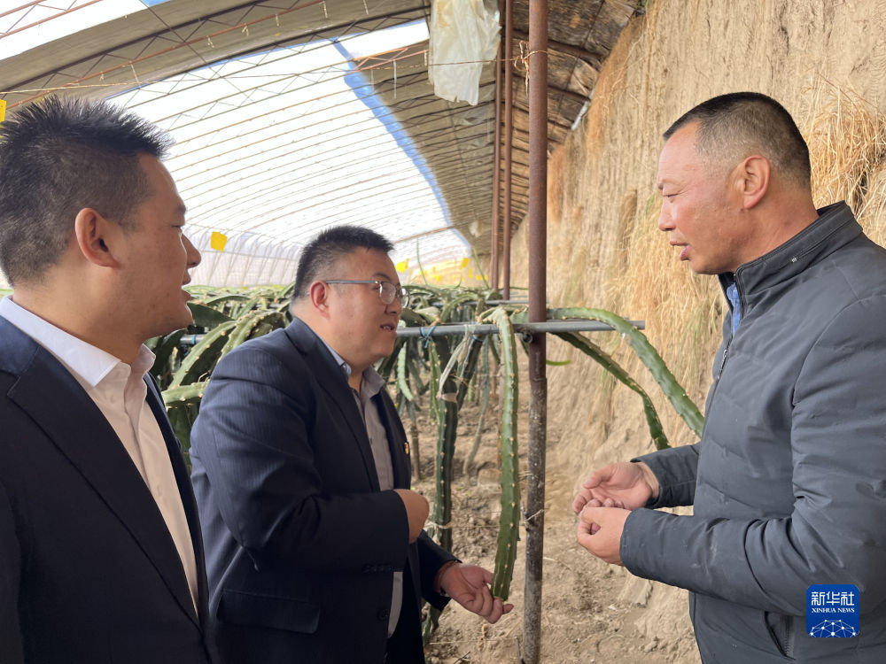 2月24日,郭存海(右)向銀行工作人員介紹火龍果生長情況。新華社記者 解統(tǒng)強 攝