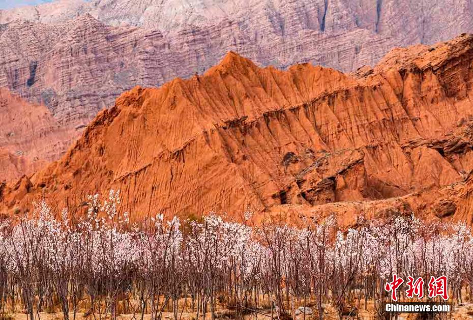 圖為丹霞地貌與杏林互映。趙海梅 攝