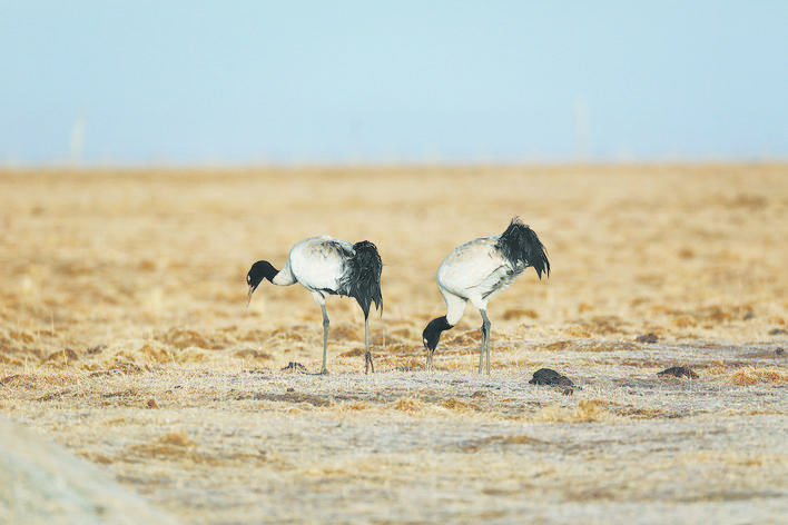 3月28日,早上八點(diǎn)左右,記者來(lái)到監(jiān)測(cè)站外,遠(yuǎn)遠(yuǎn)就看見(jiàn)一對(duì)黑頸鶴在悠閑地散步。如科夫婦笑容滿面,手捧哈達(dá),一邊呼喚著“阿克窮拉(藏語(yǔ),意為親愛(ài)的黑頸鶴),你們一路辛苦啦”,一邊緩緩地走上前去。讓人驚訝的是,黑頸鶴夫婦并未驚動(dòng),心領(lǐng)神會(huì)地踱步觀望,轉(zhuǎn)而低頭覓食。