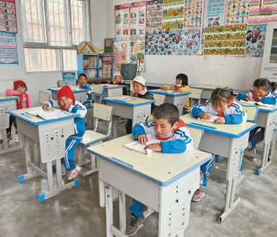 2017年,隨著易地扶貧搬遷政策的落實,越來越多村民選擇搬到山腳開始新的生活。學校里的孩子們由32名減少到9名。“9個孩子有7個是留守兒童,最大的8歲,最小的3歲?!蓖昝慈试霭押诎宸殖蓛蓧K,左邊是一年級,右邊是學前班,“安排了語文、數(shù)學、美術(shù)、道德與法治4門課,采用復式班的教學模式”。