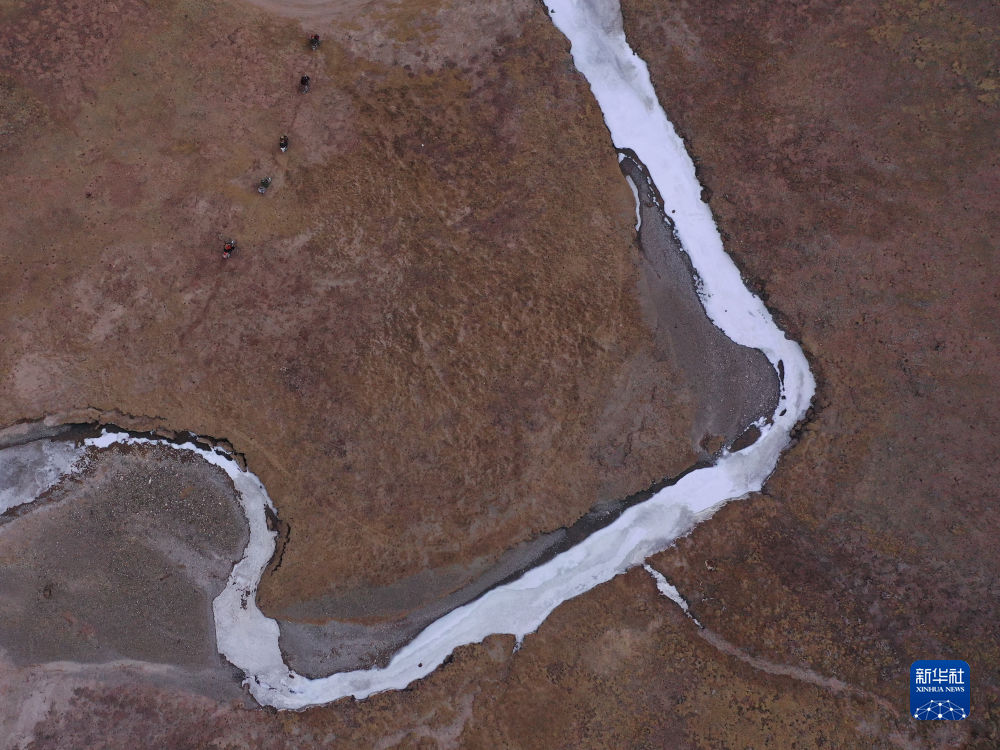 4月21日,在青海省玉樹藏族自治州曲麻萊縣麻多鄉(xiāng)約古宗列曲附近,生態(tài)管護(hù)員在巡護(hù)(無人機照片)。新華社記者 張龍 攝