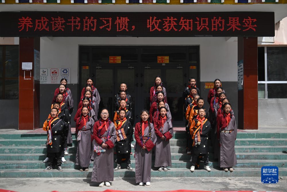4月22日,青海省玉樹藏族自治州曲麻萊縣巴干鄉(xiāng)寄宿制小學的學生在學校組織的“世界讀書日”活動中誦讀經(jīng)典。新華社記者 張龍 攝