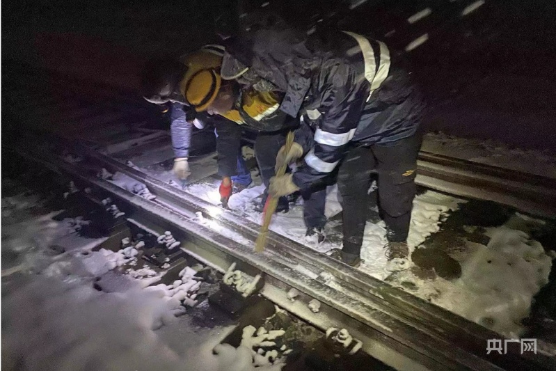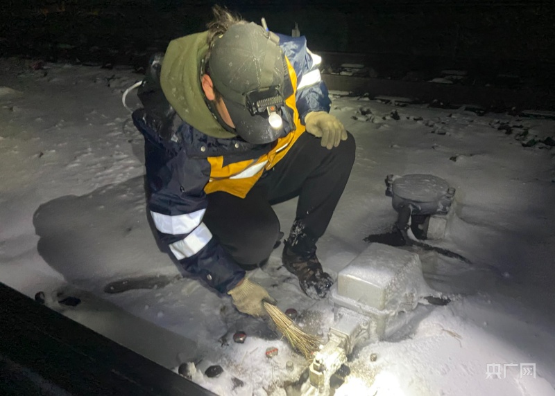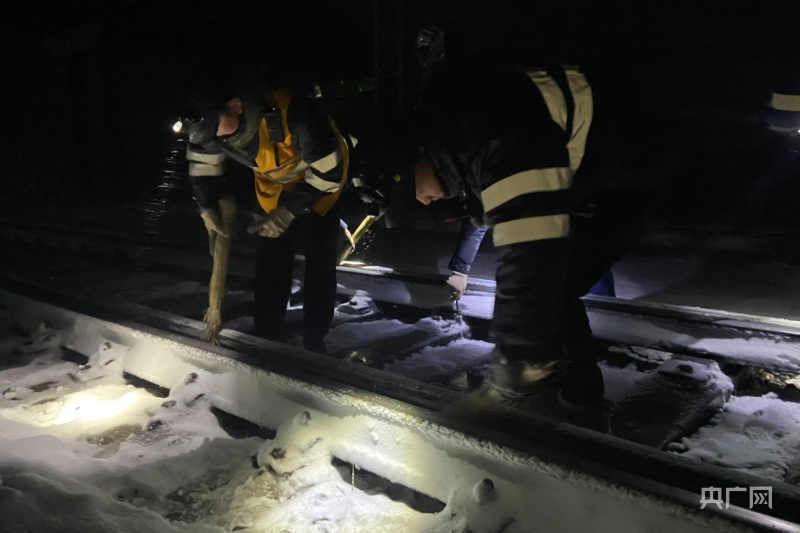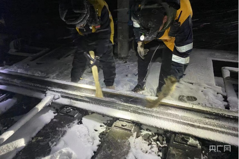 深夜風雪中,清掃道岔滑床板。央廣網(wǎng)發(fā) 余國棟 攝