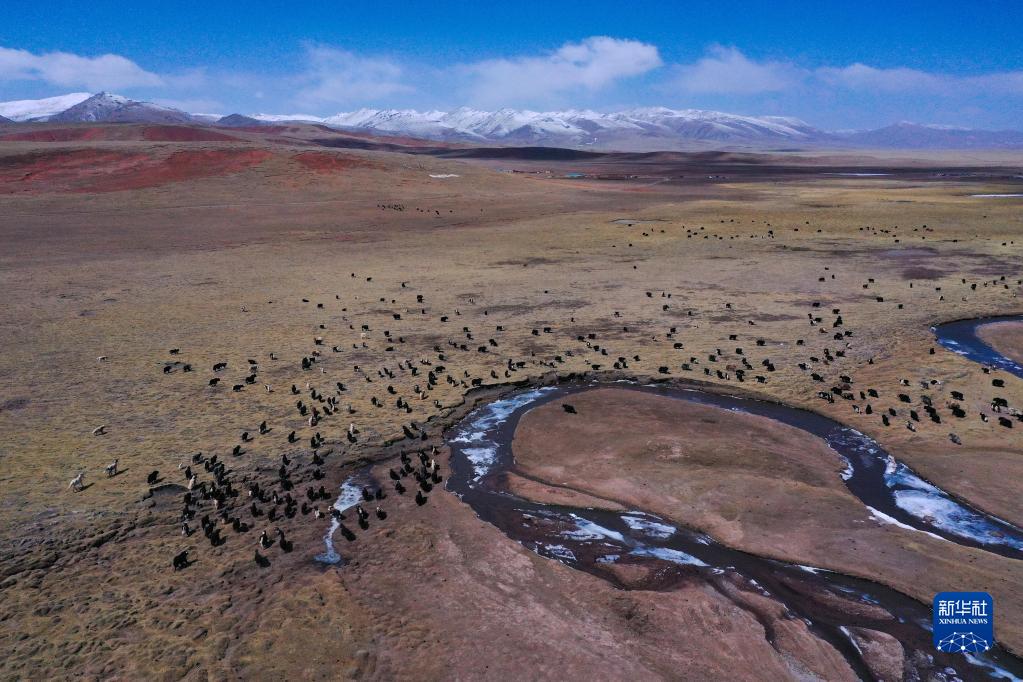 4月19日,在青海省玉樹藏族自治州治多縣,牦牛在覓食(無人機照片)。新華社記者 張龍 攝