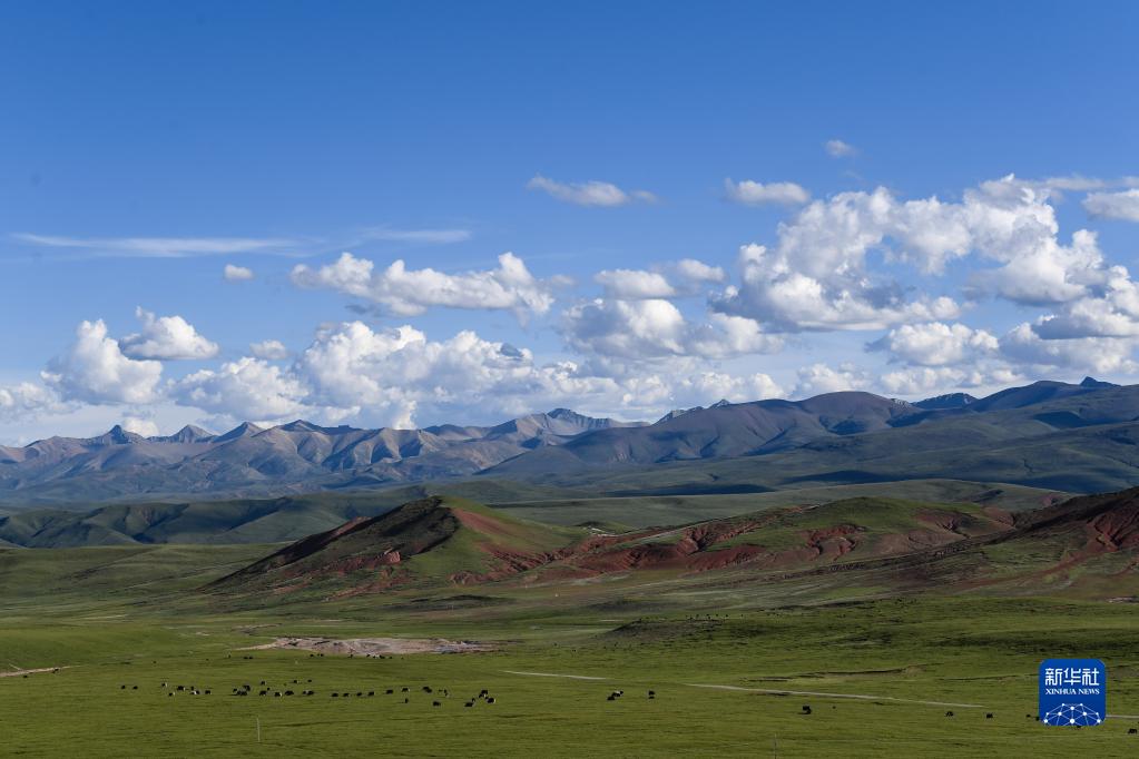 2021年7月23日,在青海省玉樹藏族自治州境內的草原上,牦牛在覓食。新華社記者 張龍 攝