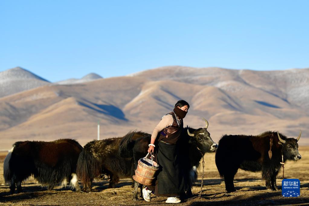 2020年10月28日,在青海省玉樹藏族自治州稱多縣珍秦鎮(zhèn),牧民準備給牦牛擠奶。新華社記者 張龍 攝