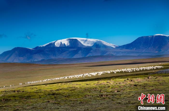 圖為天峻縣境內(nèi)的草原和藍(lán)天、雪山相照映。天峻縣委宣傳部 供圖