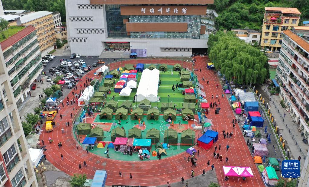 6月10日拍攝的馬爾康市州醫(yī)院背后廣場安置點(無人機(jī)照片)。新華社記者 劉坤 攝