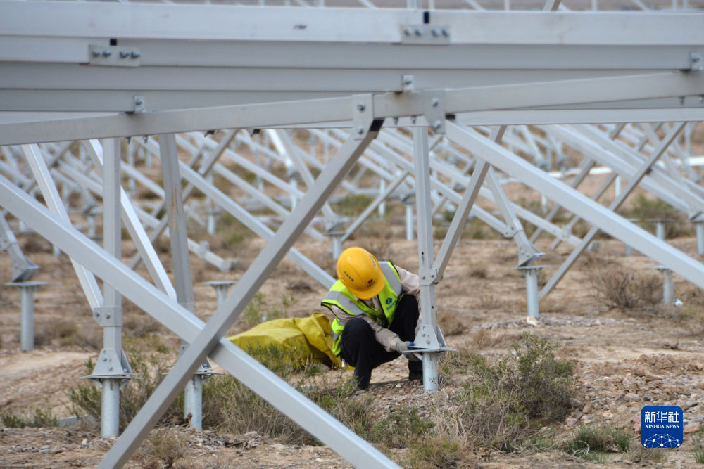 6月7日,在國家電投集團黃河公司德令哈220萬千瓦多能互補項目一期100萬千瓦光伏項目建設(shè)現(xiàn)場,工人在安裝光伏支架。新華社記者 王浡 攝