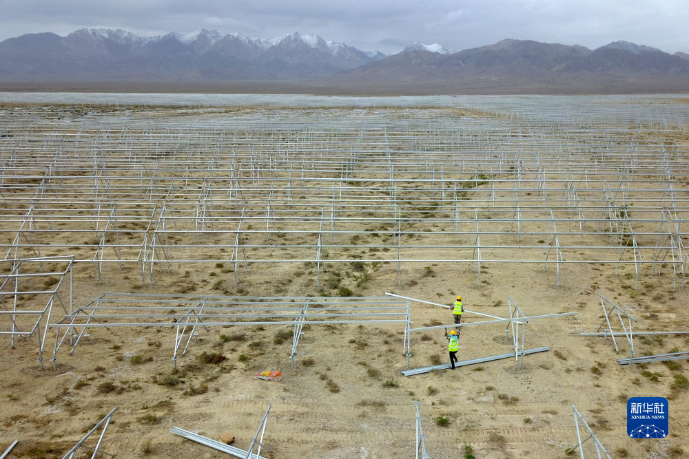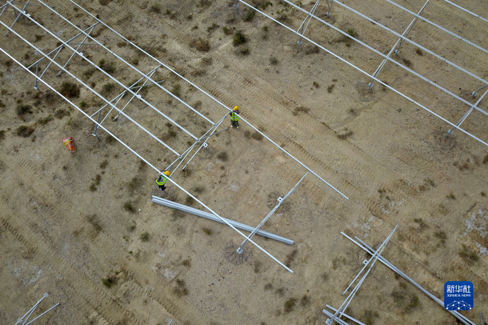 6月7日,在國家電投集團黃河公司德令哈220萬千瓦多能互補項目一期100萬千瓦光伏項目建設(shè)現(xiàn)場,工人安裝光伏支架(無人機照片)。新華社記者 范培珅 攝