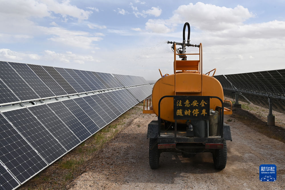 6月7日,在海西蒙古族藏族自治州德令哈市光伏(光熱)產(chǎn)業(yè)園的一家光伏電站,工作人員準備駕駛車輛清潔光伏板。新華社記者 范培珅 攝