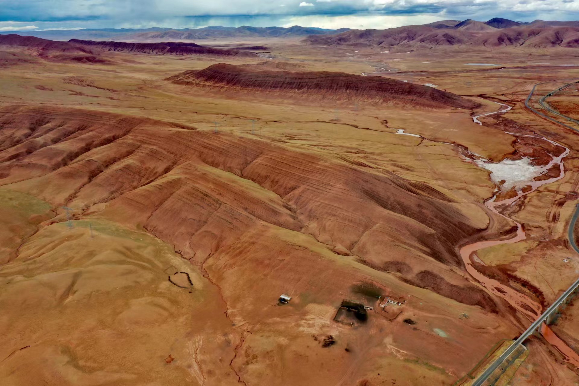 近日,中國地質(zhì)大學(xué)(武漢)長江科考先遣隊(duì)員張永一行進(jìn)行綜合科學(xué)考察時(shí),在青藏公路日阿尺曲一帶發(fā)現(xiàn)一條紅色山脈,是青藏高原109國道沿線一處壯觀的地質(zhì)遺跡。該山脈由晚白堊紀(jì)鈣質(zhì)膠結(jié)的粉、細(xì)砂巖與古近紀(jì)紫紅色、磚紅色復(fù)成份礫巖所組成,呈近東西走向,兩坡不對稱,南陡北緩,地層剖面出露清楚。