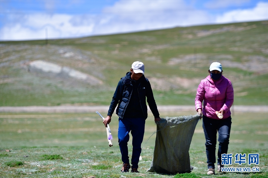 果洛州瑪多縣瑪查理鎮(zhèn)噶丹村,生態(tài)管護員在村子周邊的草原上撿拾垃圾。(資料照片)新華社記者 張龍 攝
