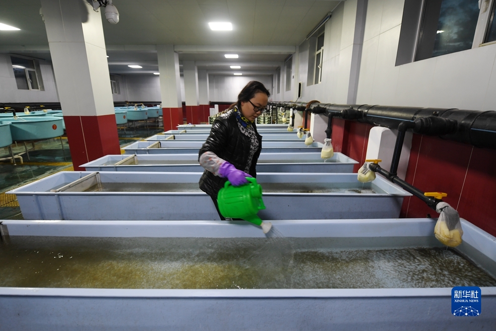 6月29日,在青海湖裸鯉沙柳河泉吉河增殖實驗站,工作人員給條形培育槽中的湟魚苗灑喂調(diào)配的營養(yǎng)液。新華社記者 范培珅 攝