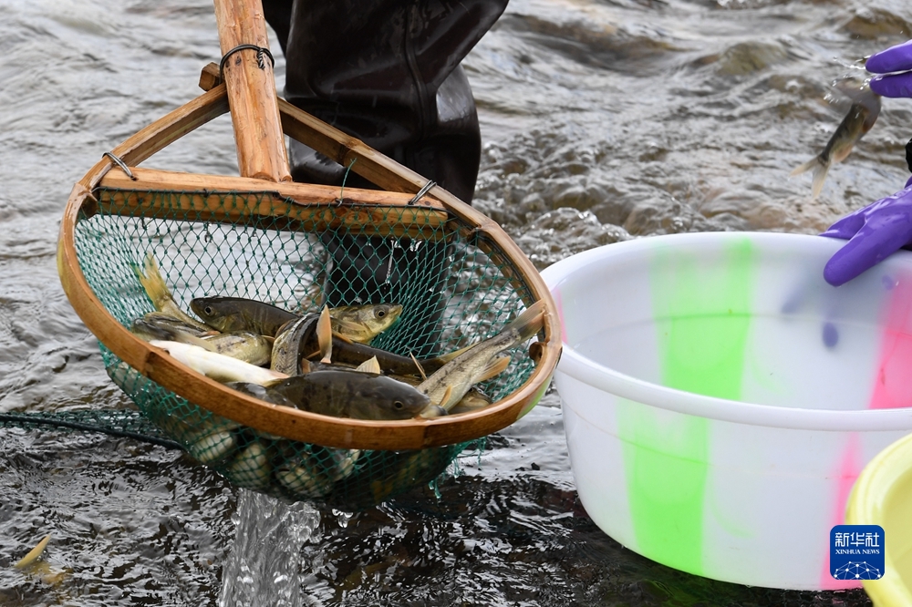 6月29日,工作人員在剛察縣境內(nèi)的泉吉河中采捕親魚。新華社記者 范培珅 攝
