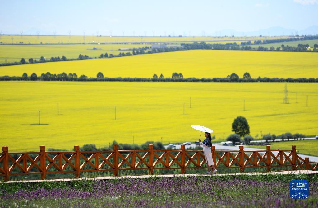 7月3日,游客在青海省海北藏族自治州門源回族自治縣境內一處景區(qū)游玩。新華社記者 張龍 攝
