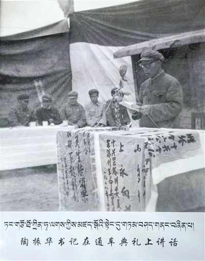 圖為1952年8月工作團(tuán)在達(dá)日縣查郎寺召開(kāi)果洛頭人、代表聯(lián)誼會(huì)議,扎喜旺徐團(tuán)長(zhǎng)在聯(lián)誼會(huì)議上作有關(guān)民族團(tuán)結(jié)的報(bào)告。圖片由央金提供