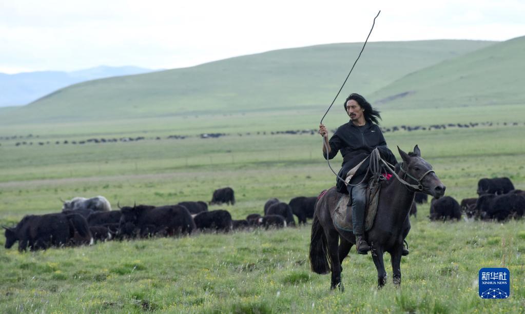 7月13日傍晚,巴周在微雨中騎馬驅(qū)趕牦牛入圈。新華社記者 陳燮 攝