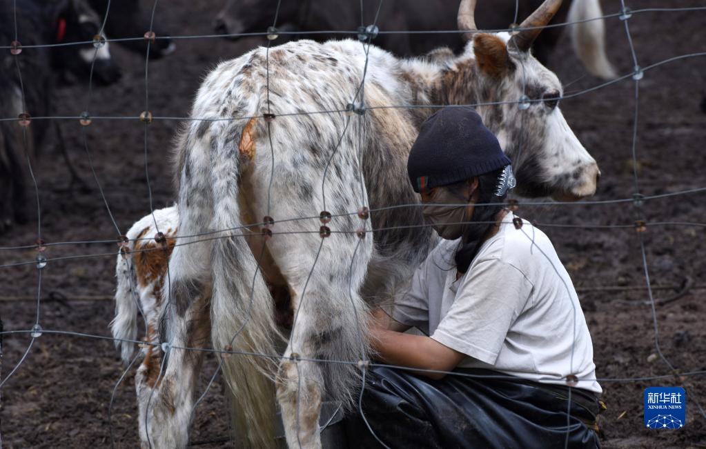 7月13日,巴周的大女兒足巴措在給牦牛擠奶。新華社記者 陳燮 攝