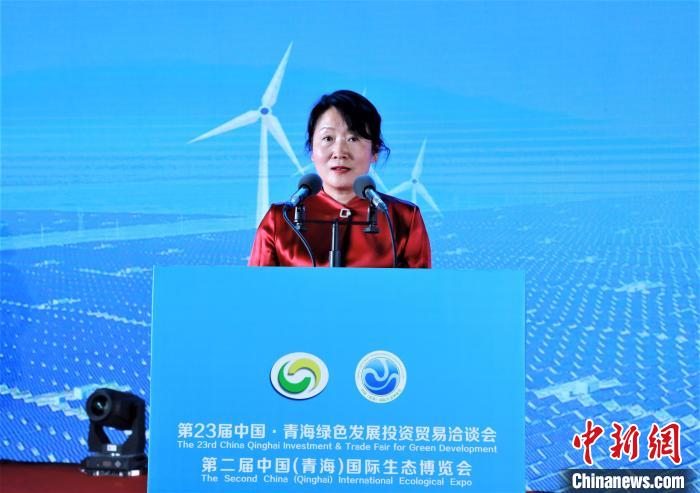 圖為海南州政府副州長(zhǎng)獨(dú)金萍進(jìn)行投資環(huán)境說明推介?!☆佨?攝