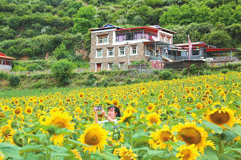 7月24日,從四川省阿壩藏族羌族自治州馬爾康市區(qū)出發(fā),行駛20多公里便抵達松崗鎮(zhèn)洛威村。一下車,成片的向日葵花海撲入眼簾,錯落有致的藏式民居點綴其間。