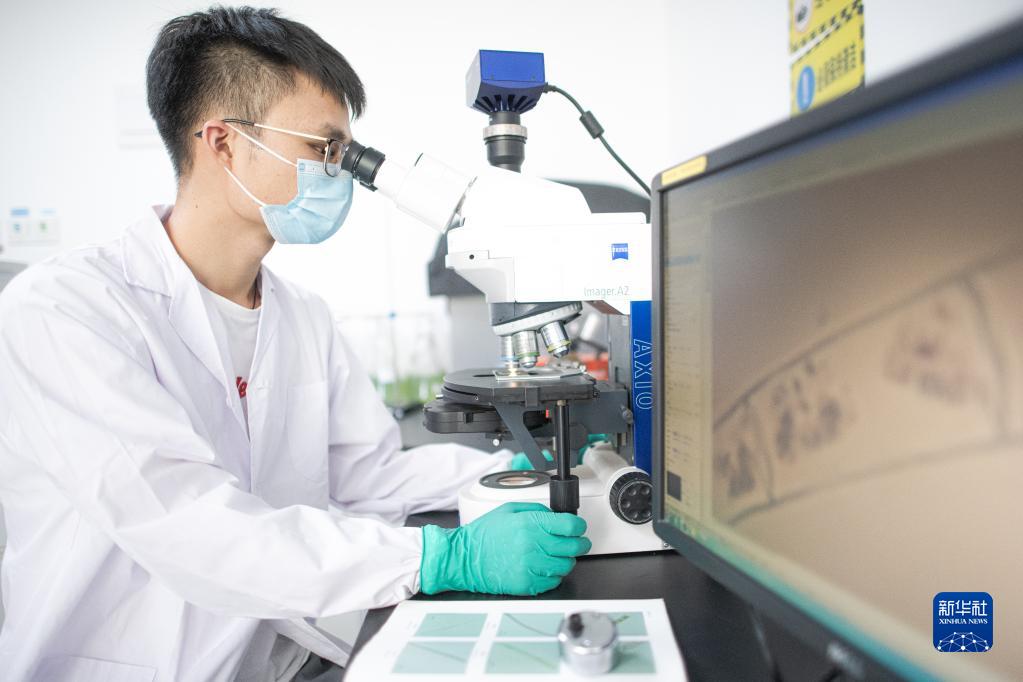 8月3日,在長江科學(xué)院實驗室,科研人員對長江源區(qū)采集的藻類樣本進行鑒定。 新華社記者 肖藝九 攝