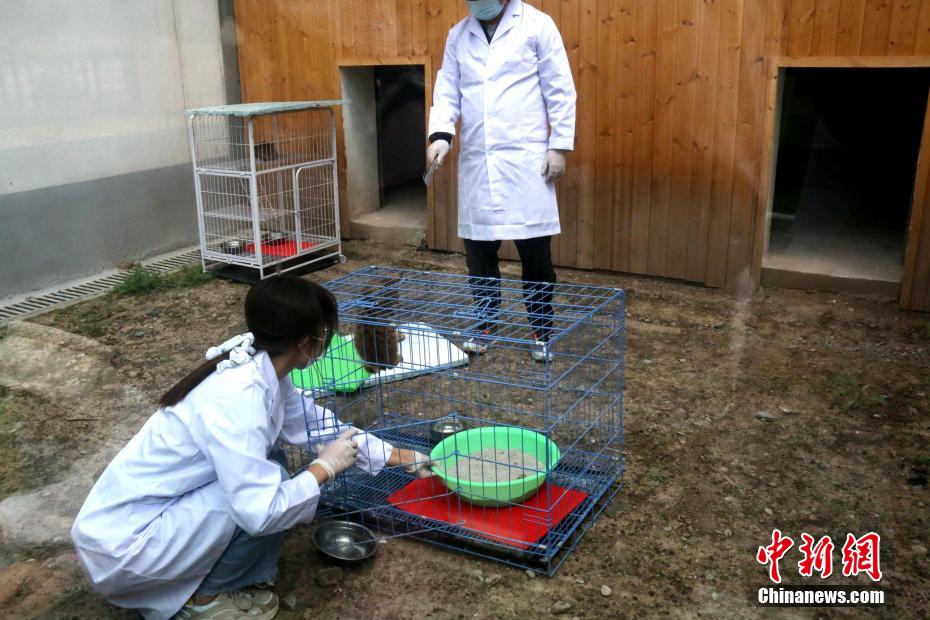 圖為“奶爸”“奶媽”給國家一級重點(diǎn)保護(hù)野生動物荒漠貓換貓砂。 張?zhí)砀?攝