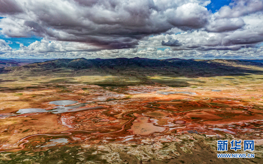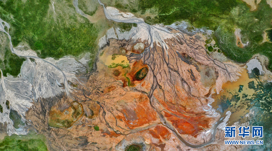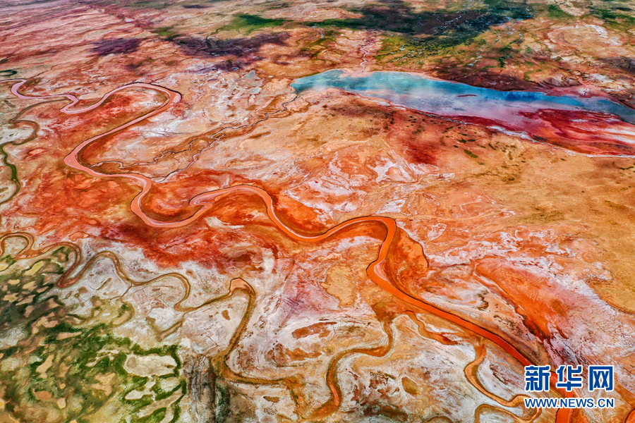 高空俯瞰阿拉克湖國家濕地公園,大地紋理清晰、赤紅嫩綠分明。