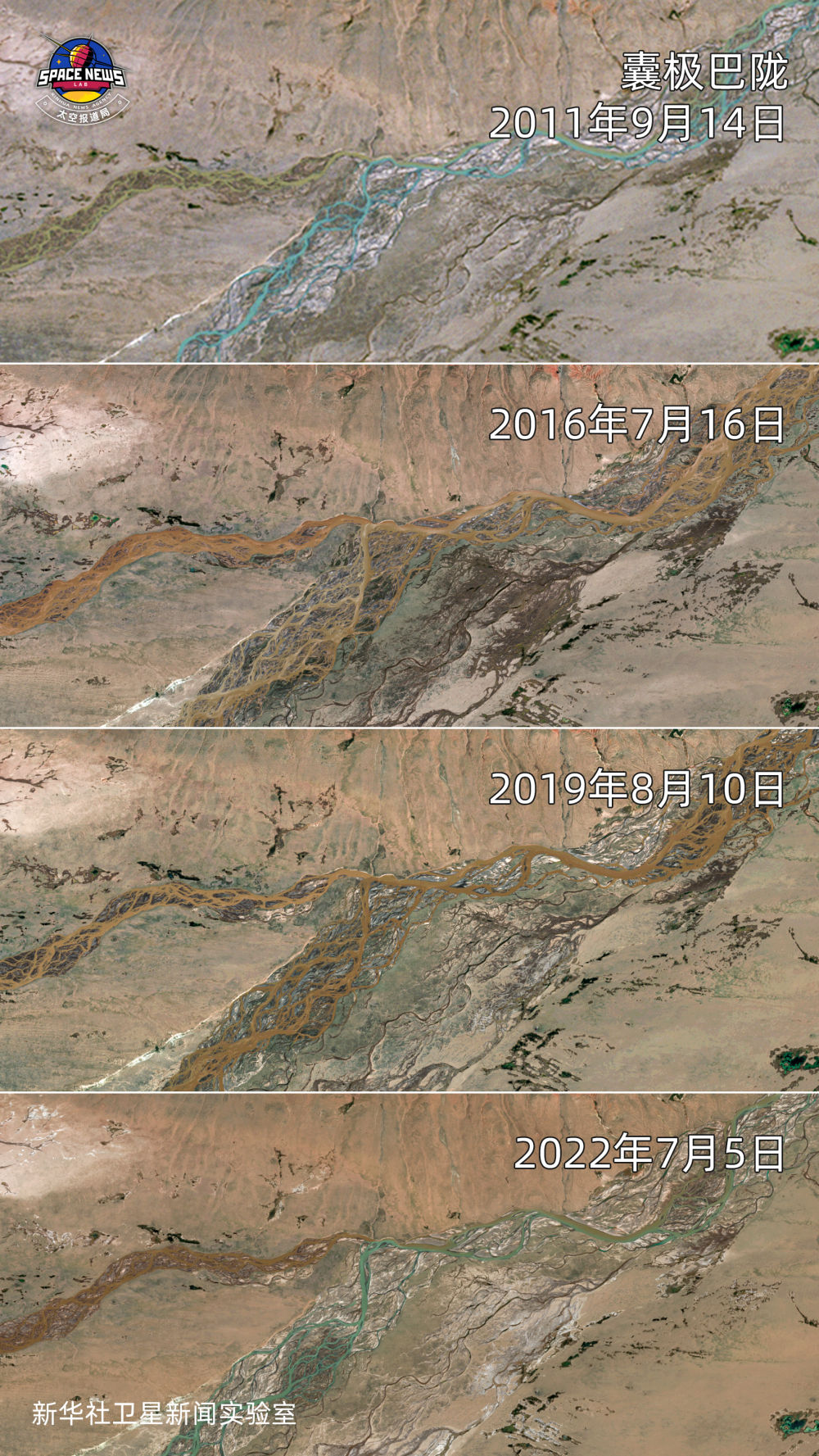 在長江正源沱沱河和南源當(dāng)曲匯合的囊極巴隴,不同時(shí)期的衛(wèi)星圖像清晰顯示,江源水系河道沖淤頻繁,水流不斷分汊又匯集,鳥瞰就像在大地上扎起許多小辮子。
