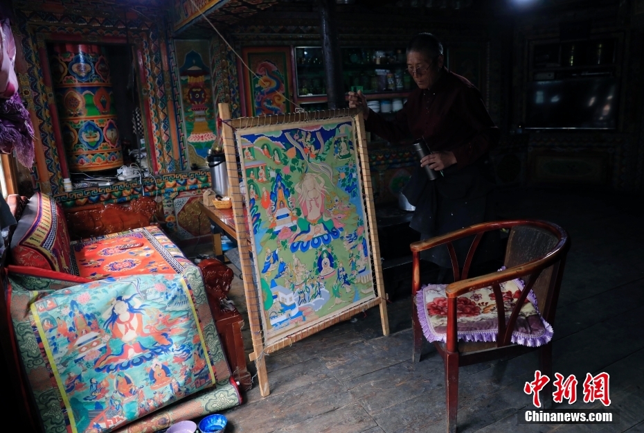 8月17日,日斯?jié)M巴碉房的主人洛吾王爾甲在客廳里準(zhǔn)備繪制唐卡。日斯?jié)M巴碉房坐落于四川省阿壩藏族羌族自治州壤塘縣宗科鄉(xiāng)加斯?jié)M村石波寨,修建于元末明初,距今已有近700年的歷史。碉房共分九層,高25.6米,外型呈階梯狀,是一座保存完好的藏式傳統(tǒng)民居。2006年,日斯?jié)M巴碉房被列為全國(guó)重點(diǎn)文物保護(hù)單位。 中新社記者 王磊 攝