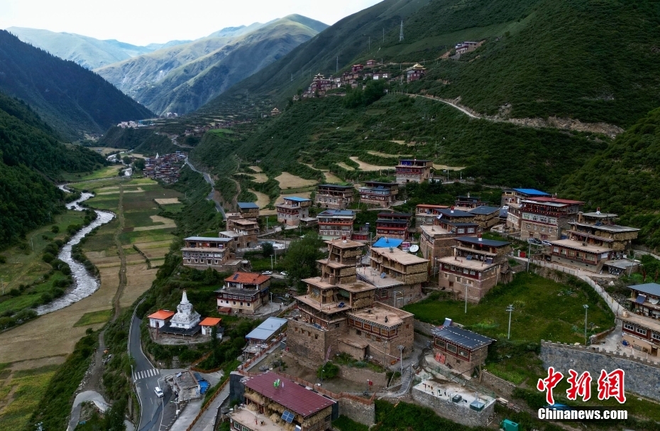 8月17日,航拍日斯?jié)M巴碉房外景。日斯?jié)M巴碉房坐落于四川省阿壩藏族羌族自治州壤塘縣宗科鄉(xiāng)加斯?jié)M村石波寨,修建于元末明初,距今已有近700年的歷史。碉房共分九層,高25.6米,外型呈階梯狀,是一座保存完好的藏式傳統(tǒng)民居。2006年,日斯?jié)M巴碉房被列為全國(guó)重點(diǎn)文物保護(hù)單位。(無(wú)人機(jī)照片) 中新社記者 王磊 攝