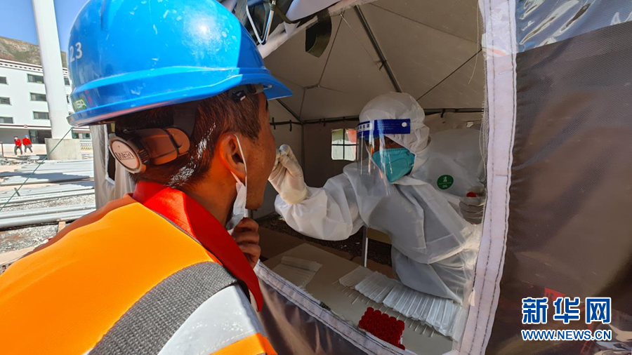 瑪爾擋水電站建設(shè)現(xiàn)場,施工人員排隊進行核酸檢測。新華網(wǎng) 劉小芳 攝
