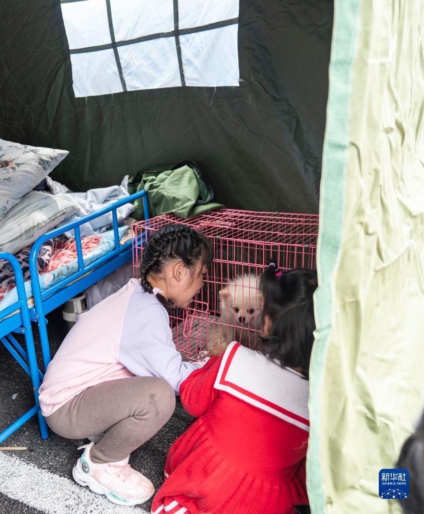 9月6日,在四川甘孜州瀘定縣磨西鎮(zhèn)海螺溝廣場(chǎng)受災(zāi)群眾臨時(shí)安置點(diǎn),兒童與從家中帶過(guò)來(lái)的小狗玩耍。新華社記者 才揚(yáng) 攝