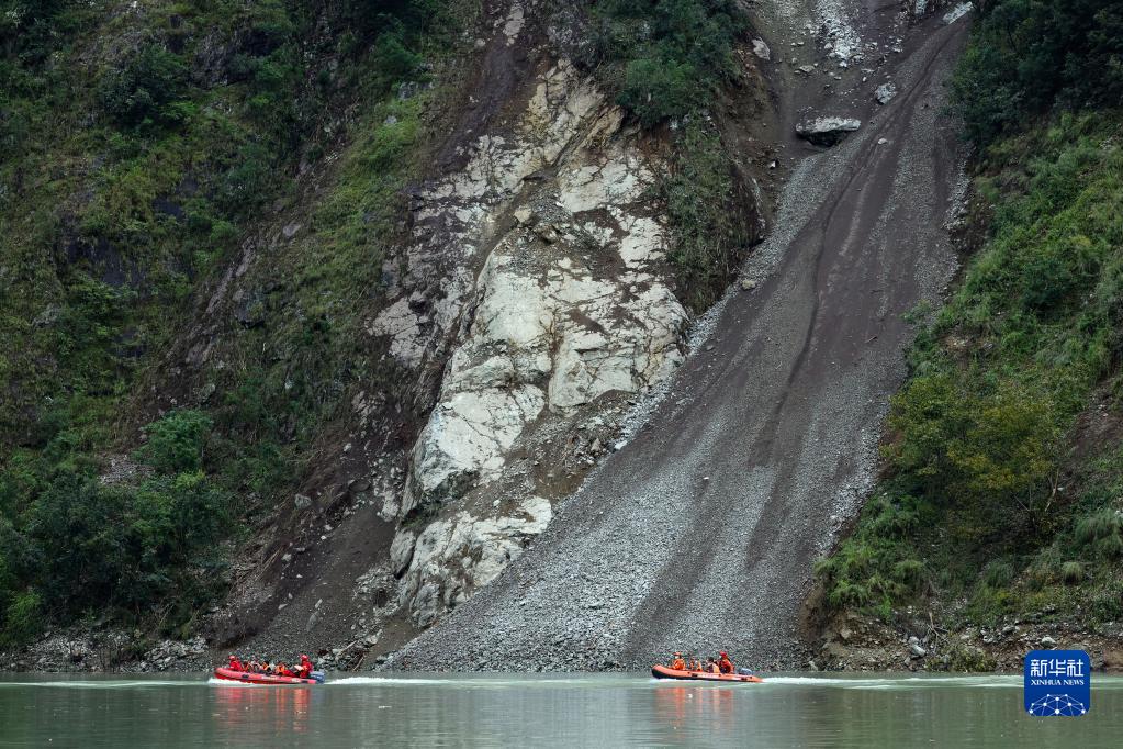 9月6日,救援人員乘坐橡皮艇經(jīng)水路,再爬山路進入瀘定縣得妥鎮(zhèn)灣東村。新華社記者 沈伯韓 攝