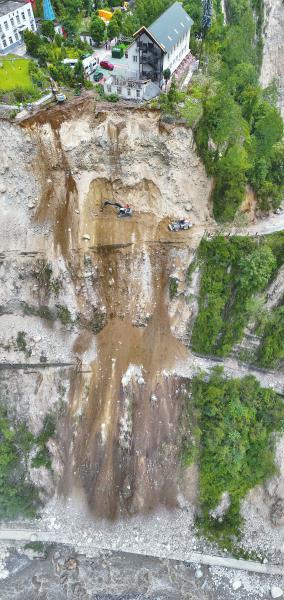 距磨西鎮(zhèn)1公里處的斷道點,7.5米寬的公路路面,只剩下不到一半。剩余的路面呈懸空狀態(tài),下面是300米深的崖谷。受損如此嚴重,這段公路短期內(nèi)無法原路修復(fù),須另修一條便道,避開斷道點。