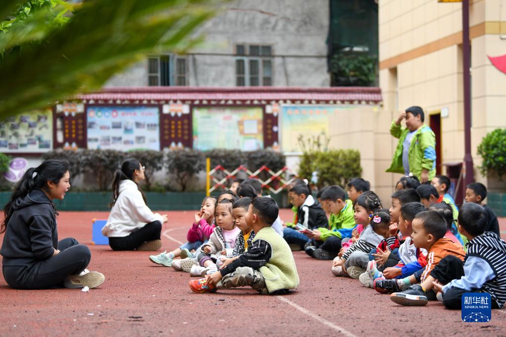 9月7日,在石棉縣草科鄉(xiāng)中心小學操場上,老師在給附屬幼兒園的小朋友上課。新華社記者 胥冰潔 攝