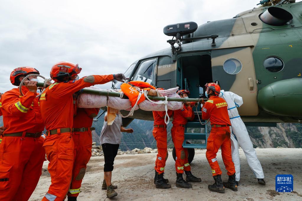 9月6日,救援人員抬著一名從瀘定縣得妥鎮(zhèn)灣東村疏散出來的受傷村民,準備通過直升機將其運出。新華社記者 沈伯韓 攝